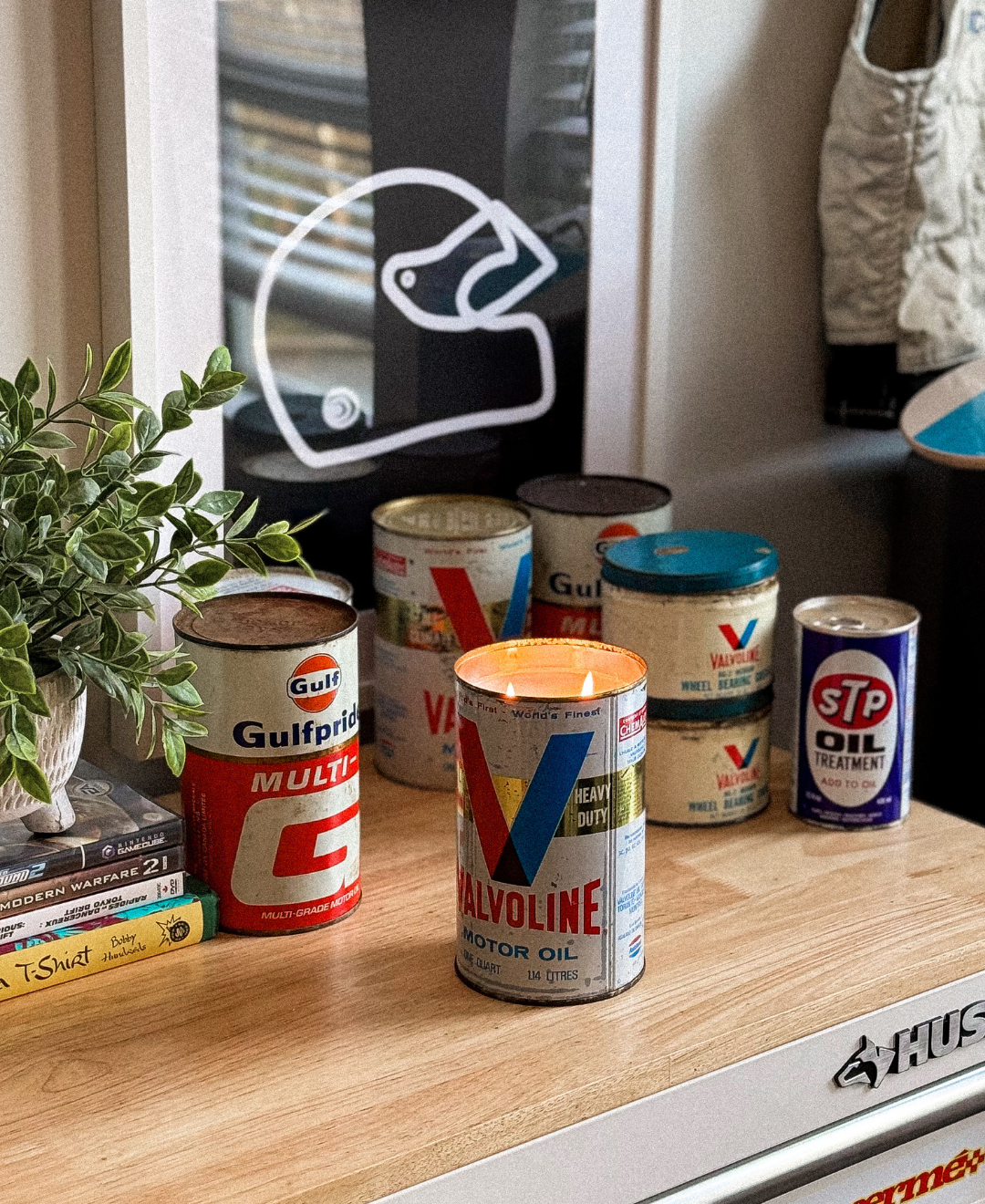 INTRODUCING A VERY LIMITED RUN OF 1-OF-1 CANDLES, CRAFTED FROM GENUINE VINTAGE OIL CANS FROM THE 1960S, EACH CAREFULLY SELECTED FOR ITS UNIQUE PATINA. RESTORED AND HAND-POURED IN GASTOWN, VANCOUVER, FEATURING 100% NATURAL SOY WAX, SPECIALTY ESSENTIAL OILS, AND A FLAT BRAID COTTON-CORE WICK TO DELIVER A CLEAN BURN AND UP TO 100 HOURS OF AMBIANCE.